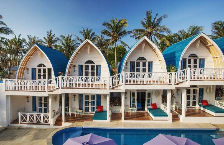 Salah satu resor yang yang menawarkan keunikan di kawasan Gili Trawangan, Lombok, NTB, adalah Santorini Beach Resort. Sesuai namanya, resor bintang 3 ini mengadopsi nuansa Santorini di Yunani. Deretan bungalow bernuansa putih dan biru lengkap dengan tanaman bougenville penuh warna.